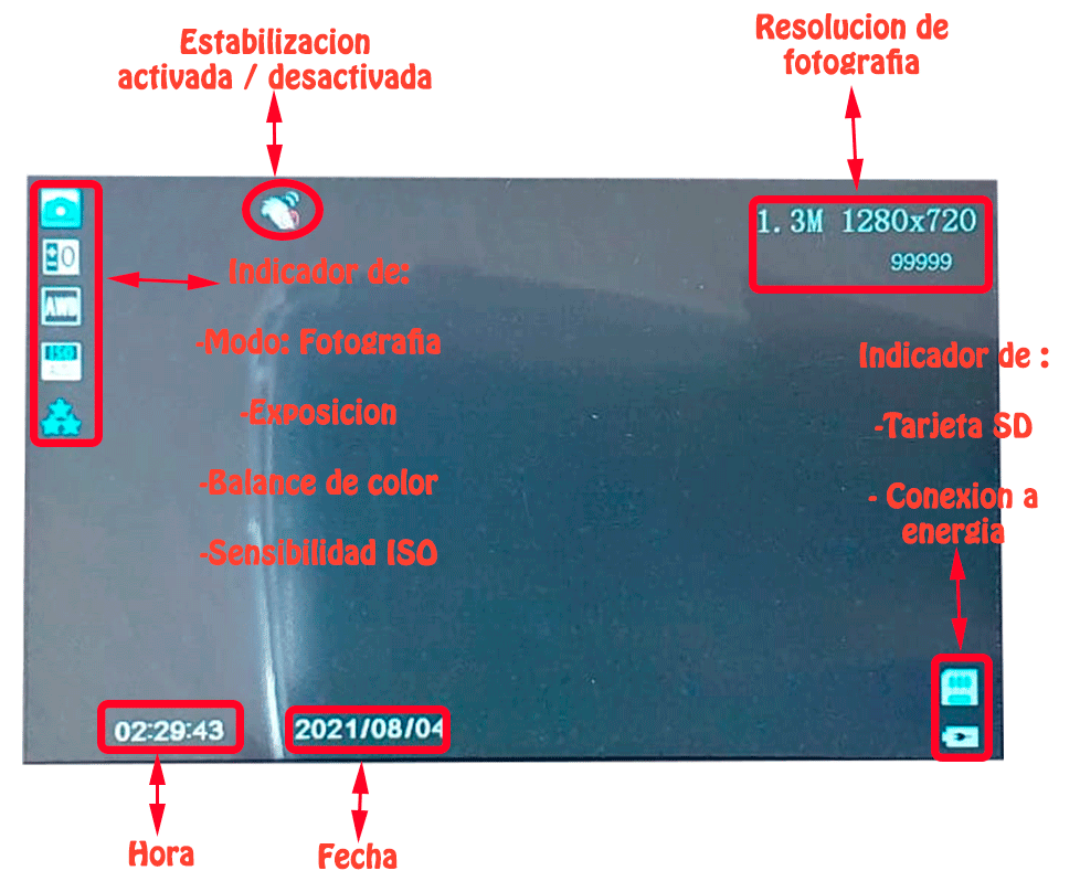 -Impresión fecha: Activa o desactiva esta función para que la pantalla ponga la marca de agua con fecha y hora en los videos o fotos tomadas.