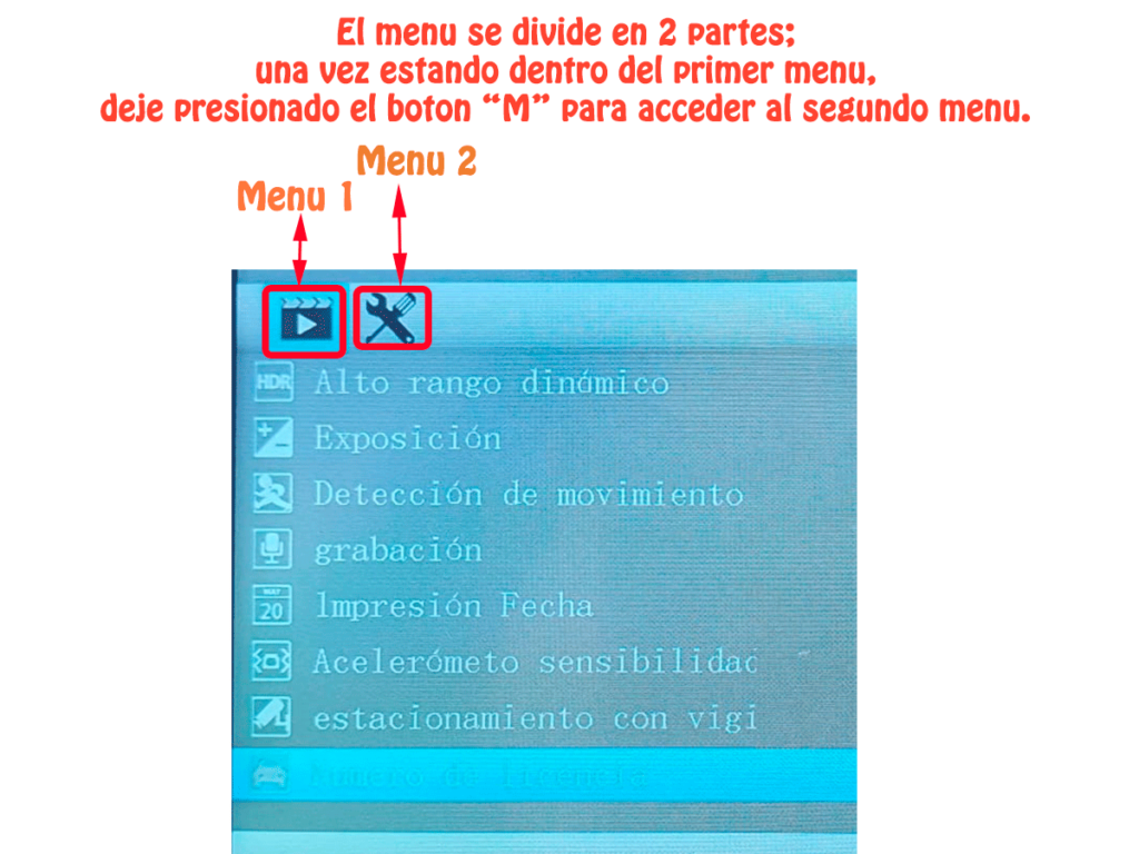 -Deje el botón «M» presionado por un tiempo prolongado para acceder al menú de ajustes: